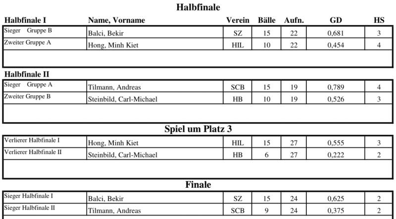 Platz | Name | Verein | Pkt. | Bälle | Aufn. | GD | BED | HS |