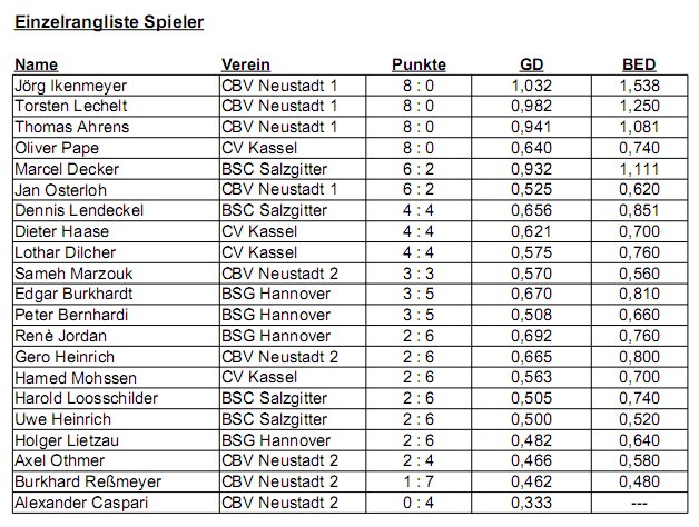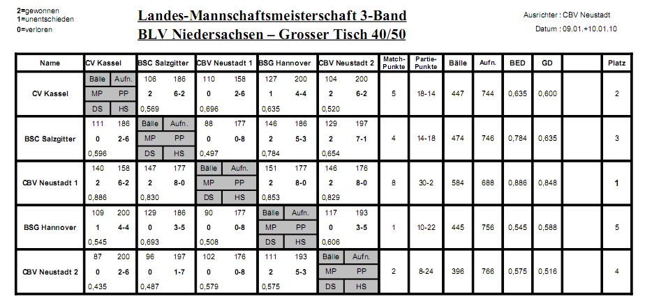 Turnierort: Calenberger Billard Verein (CBV), Teilnehmerzahl: 5 Mannschaften