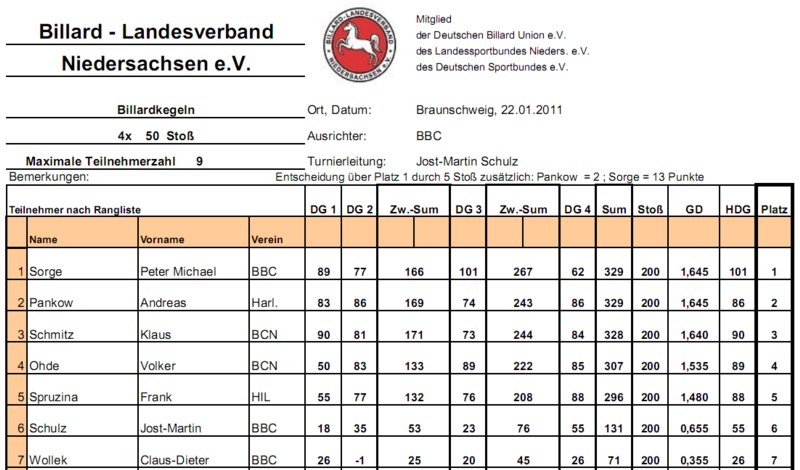 Turnierort: Braunschweiger Billard Club (BBC), Teilnehmerzahl: 7