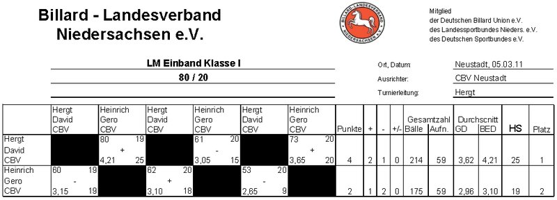 Turnierort: Calenber Billard Verein (CBV), Teilnehmerzahl: 2