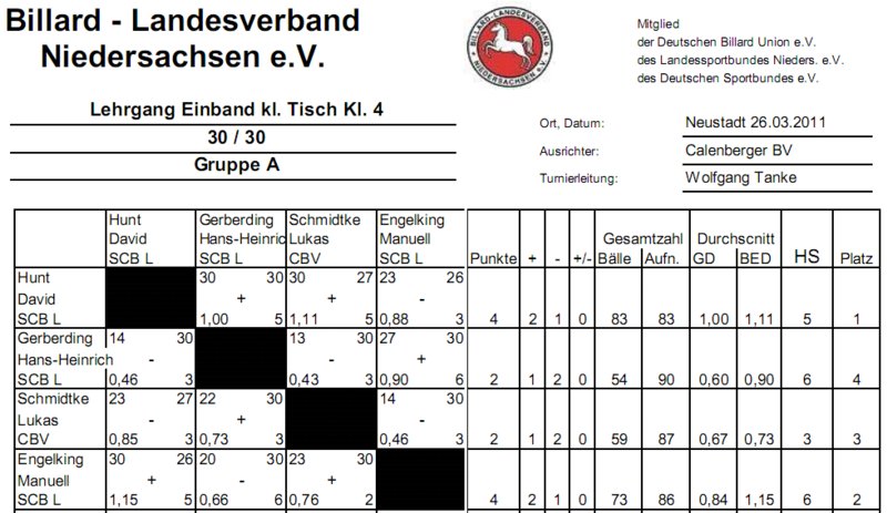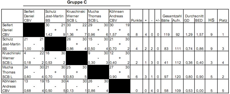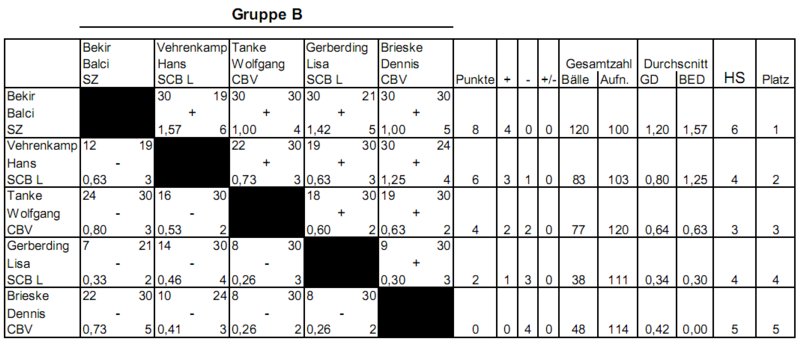 | Platz | Name | Verein | Pkt. | Bälle | Aufn. | GD | BED | HS |