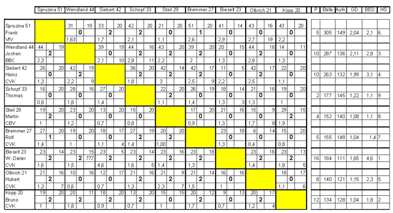 | Platz | Name | Verein | Pkt. | Bälle | Aufn. | GD | BED | HS |