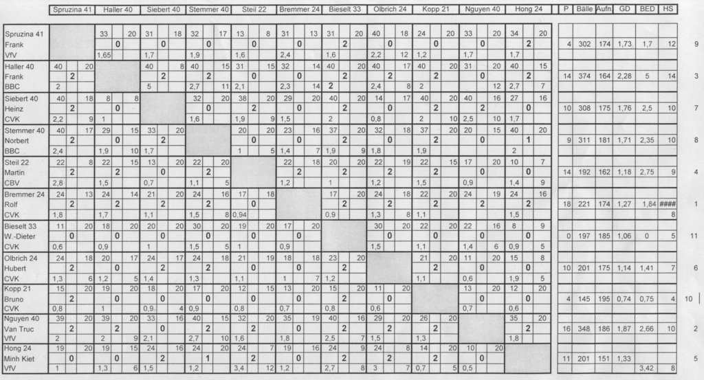 | 11. | Wolf-Dieter Bieselt | CVK | 0 | 197 | 185 | 1,06 | 5 |