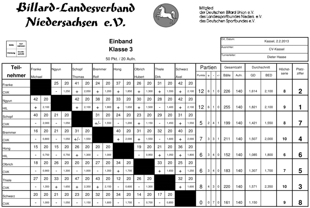 | Platz | Name | Verein | Pkt. | Bälle | Aufn. | GD | BED | HS |