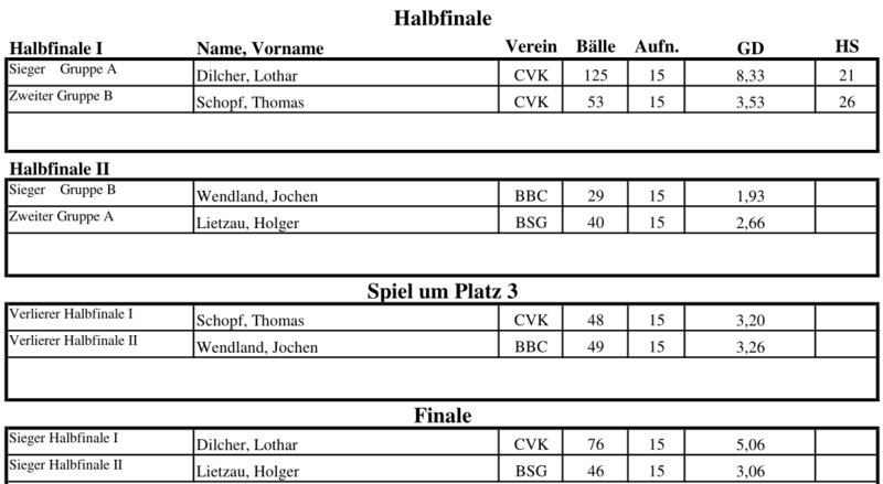 | Platz | Name | Verein | Pkt. | Bälle | Aufn. | GD | BED | HS |
