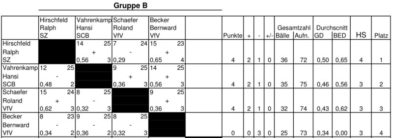 | Platz | Name | Verein | Pkt. | Bälle | Aufn. | GD | BED | HS |