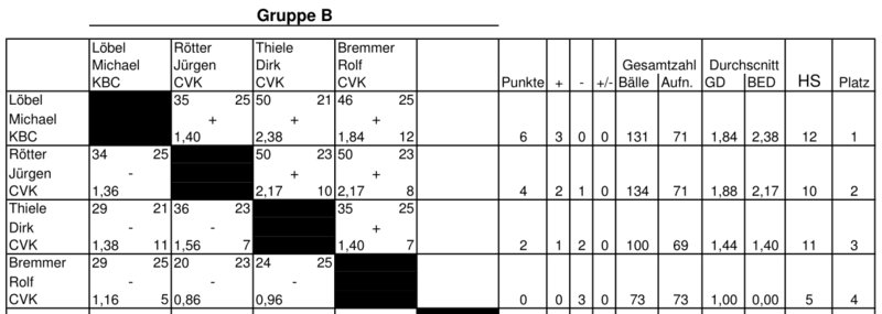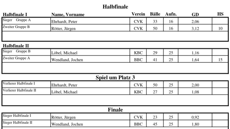 | Platz | Name | Verein | Pkt. | Bälle | Aufn. | GD | BED | HS |