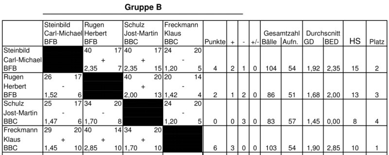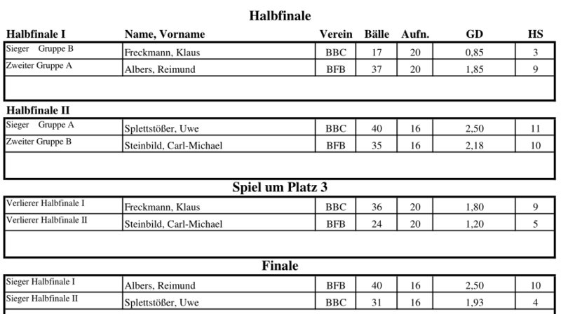 | Platz | Name | Verein | Pkt. | Bälle | Aufn. | GD | BED | HS |