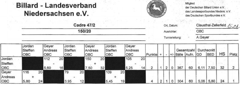Turnierort: Oberharzer Billard Verein (OBC), Teilnehmerzahl: 2