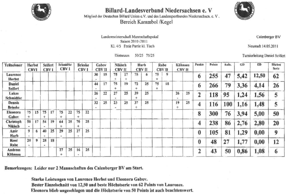 Turnierort: Calenberger Billard Verein (CBV), Teilnehmerzahl: 2 Mannschaften
