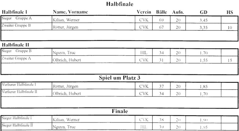 | Platz | Name | Verein | Pkt. | Bälle | Aufn. | GD | BED | HS |