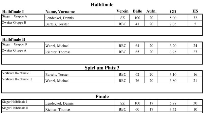 | Platz | Name | Verein | Pkt. | Bälle | Aufn. | GD | BED | HS |