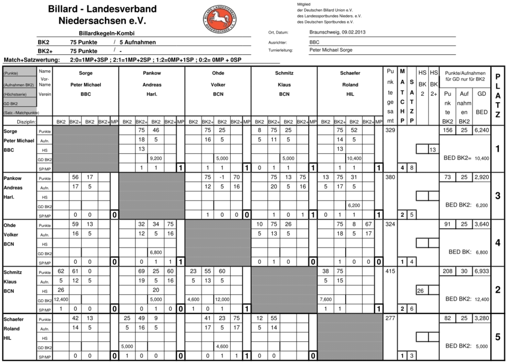 Turnierort: Braunschweiger Billard Club (BBC), Teilnehmerzahl: 5