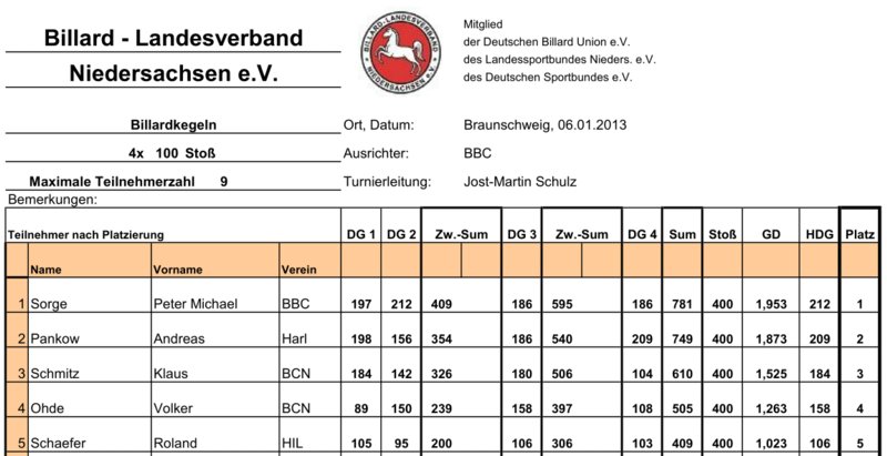 Turnierort: Braunschweiger Billard Club (BBC), Teilnehmerzahl: 5