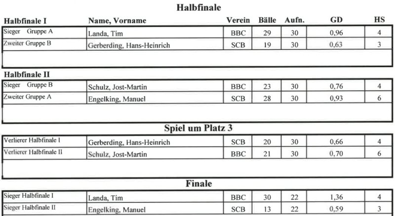 | Platz | Name | Verein | Pkt. | Bälle | Aufn. | GD | BED | HS |