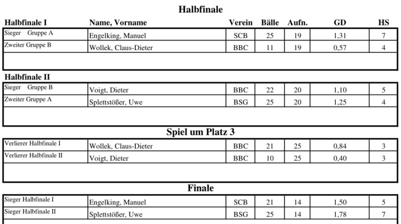 | Platz | Name | Verein | Pkt. | Bälle | Aufn. | GD | BED | HS |