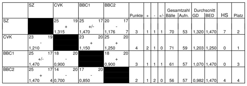 | Platz | Name | Verein | Pkt. | Bälle | Aufn. | GD |