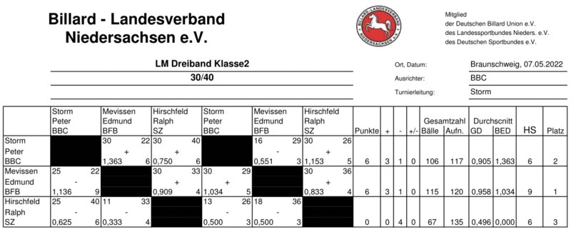 Turnierort: Braunschweiger Billard Club (BBC), Teilnehmerzahl: 3