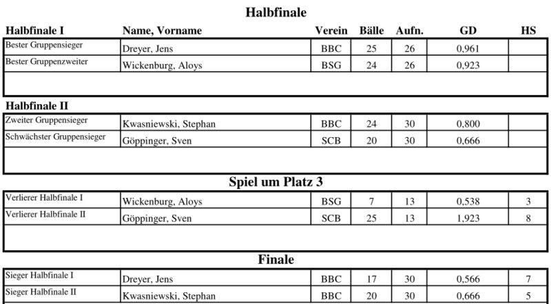 | Platz | Name | Verein | Pkt. | Bälle | Aufn. | GD | BED | HS |