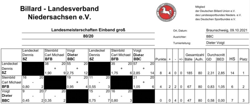 Turnierort: Braunschweiger Billard Club (BBC), Teilnehmerzahl: 3