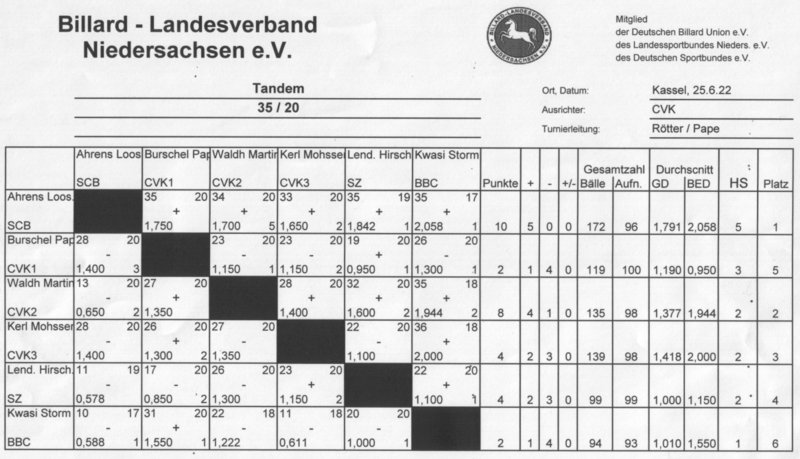 Das Team Thomas Ahrens / Harold Loosschilder (SCB) spielt in diesem Turnier einen neuen Landesrekord den GD (1,791) betreffend!