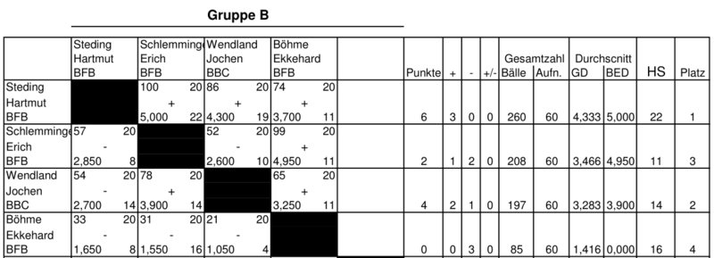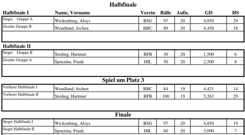 | Platz | Name | Verein | Pkt. | Bälle | Aufn. | GD | BED | HS |