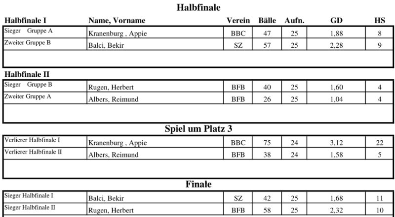 | Platz | Name | Verein | Pkt. | Bälle | Aufn. | GD | BED | HS |