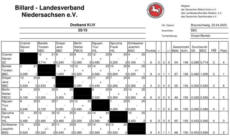 | 22.04.2023: LM Dreiband Kl.IV (großer Tisch) |