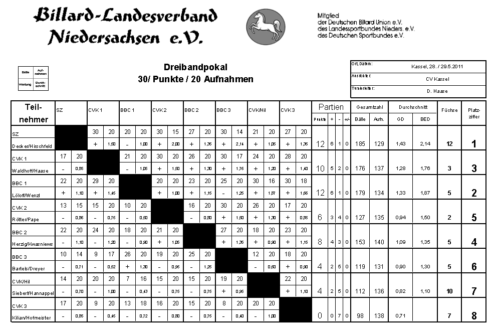 Turnierort: Carambolage Verein Kassel (CVK), Teilnehmerzahl: 9 Mannschaften